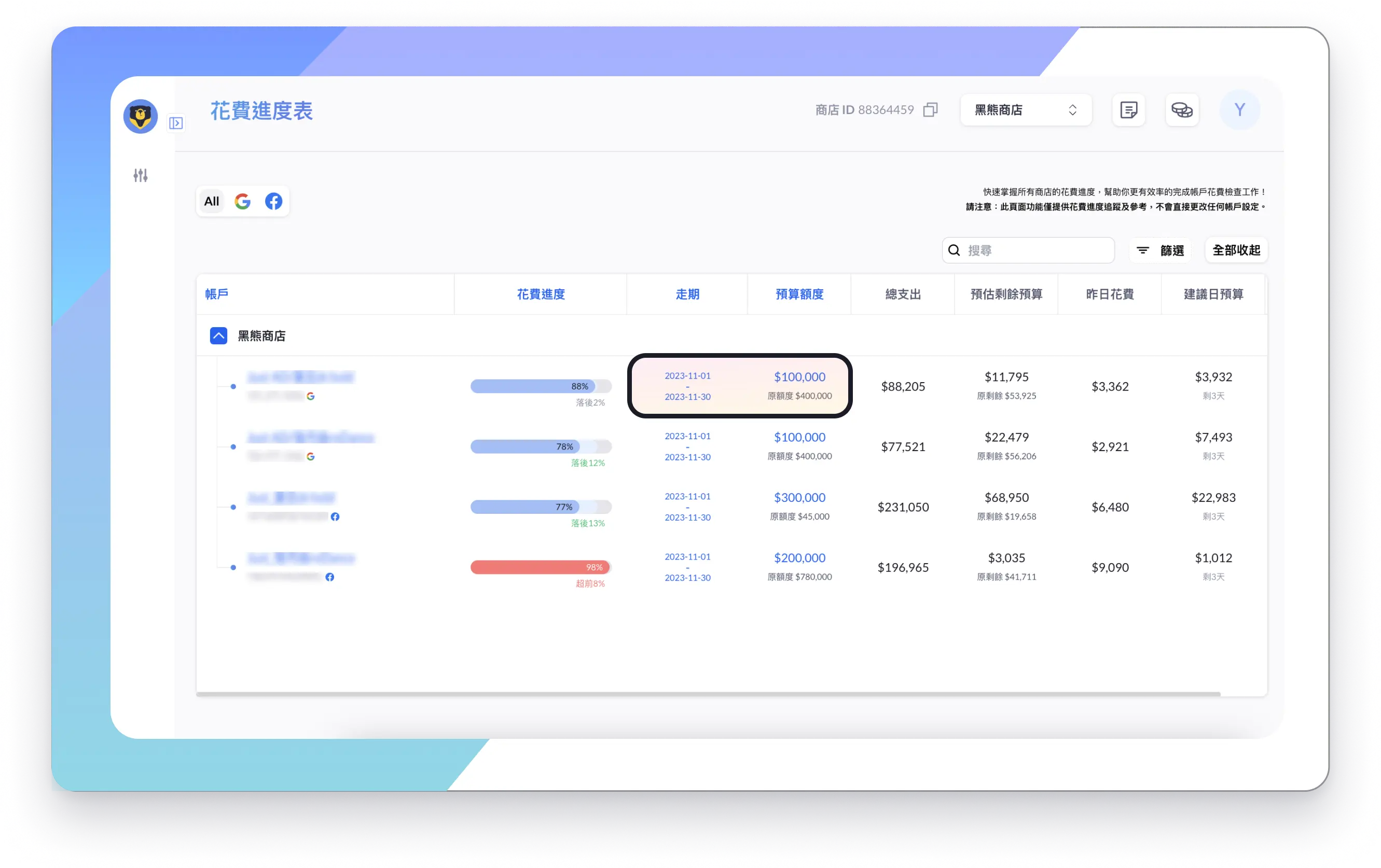 你可以按月、按週,甚至從廣告開始到現在,自行設定希望監測的花費進度走期,hey!Bear會為你計算出這段時間的花費支出,接著就可以每天盯著他,了解目前帳戶的應花費用百分比及實花費用百分比,即時調整帳戶預算了。(貼心提醒:這個功能不會更改到帳戶中的走期設定的!)