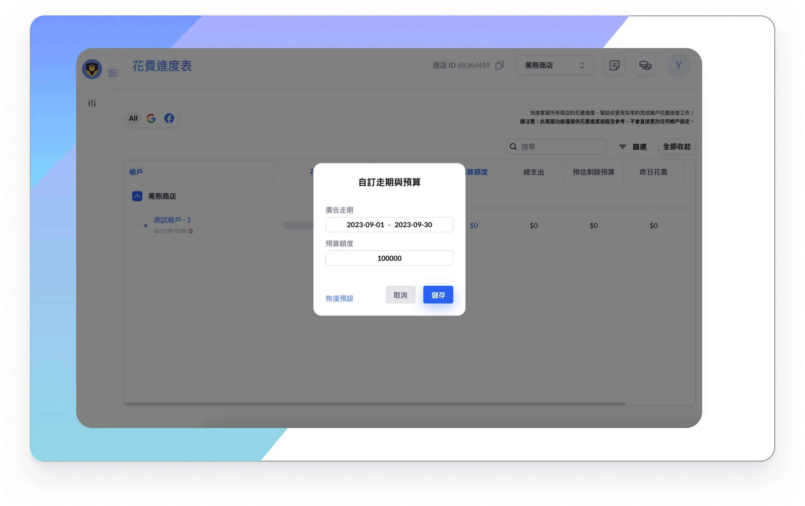 當你想要針對走期掌控一筆特別的預算花費時,你可以搭配上述的自訂走期功能,並自訂預算額度。例如:我只想要監控 9/1-9/30 的花費進度,預算是 $100,000,你只要在走期選擇 9/1-9/30 ,並輸入預算額度 $100,000,hey!Bear就會開始為你監測帳戶的廣告花費進度,以及提供建議的每日預算,再也不用費時手動計算了!